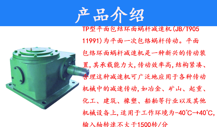 TP型平面包结环面蜗杆减速机(JB/T90511991)为平面一次包络蜗杆传动。平面包络环面蜗杆减速机是一种新兴的传动装置,其承载能力大,传动效率高,结构紧凑、合理这种减速机可广泛地应用于各种传动机械中的减速传动,如冶金、矿山、起重、化工、建筑、橡塑、船舶等行业以及其他机械设备上,适用于工作环境为-40℃-+40℃,输入轴转速不大于1500转/分