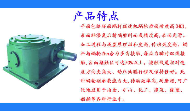 平面包络环面蜗杆减速机蜗轮齿面硬度高(HC),表面经渗氮后精确磨削而成精度高,表面光滑。加工过程与成型原理温和度高,传动效度高、蜗杆与蜗轮在n合为多齿接触,每齿为瞬时双线接触,齿面接触区可达70%以上。接触线尾相对速度方向夹角大、动压油膜行程及保持性好。此种蜗轮副承载能力大,传动效率高,耐磨损,可广泛地应用于冶金、矿山、化工、建筑、橡塑、船舶等各种行业中。
