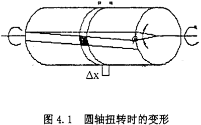 根据观察到的现象,做下述基本假设:圆周扭转变形前原为平面的横截面,变形后仍保持平面,形状和大小不变,半径仍保持为直线;且相邻两截面间的距离不变。这就是圆周扭转的平面假设。按照这一假设,扭转变形中,圆轴的横截面就像刚性平面一样,绕轴线旋转了个角度。以平面假设为基础到处的应力和变形计算公式,符合试验结果,且与弹性力学一致。