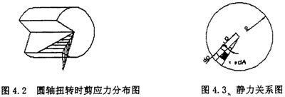 ρ与该点到原新的距离ρ成正比。因为Yρ发生于垂直于半径的平面内,所以Yρ也与半径垂直。如果注意到剪应力互等定理,则在纵向截面和横截面上,沿半径剪应力的分布如图4.2所示