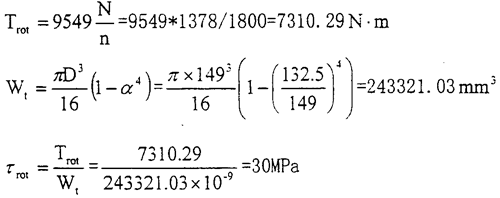 根据实际情况计算出工作时的剪应力:GK2型内燃机车启动发电机ZQF-38TH,115V,38KW,1170~358Or/min;GK2型内燃机机用柴油机型号为MTU16V396TC14,持续功率为1378KW,旋转角速度为18O0rad/min。柴油机冷区液温度为40℃时最小启动转矩包括加速余量约8OON.m,曲轴扭矩约75ON.m