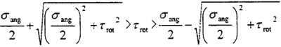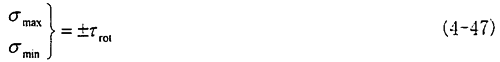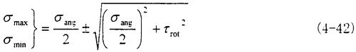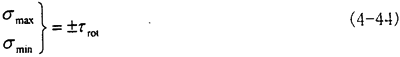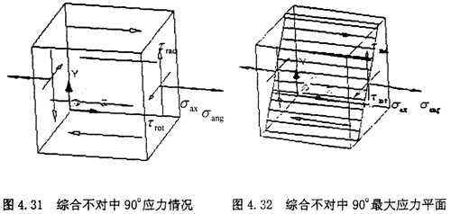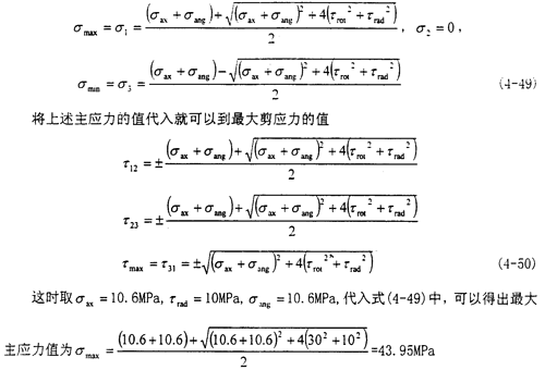 此时的应力情况属于三向应力状态,所以其分析过程和径向不对中90°以及270°以情况相似,只是这里还有了附加的轴向拉应力和附加的角向应力,将各个应力值σxx=σax+σang,σyy=0,σzz=0,τxy=τrot,τyz=0,τzx=τrad分别代入式(4-29)(4-30)(4-31)中,可以得到