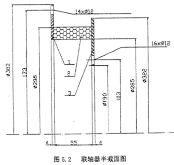 根据实际情况观察可知橡胶块左右分别有两块钢板,析上均有一些圆孔,通过实际测量得到联轴器的基本尺寸和形状。由于联轴器为轴对称图形,故只画出其截面图(图5.2)。