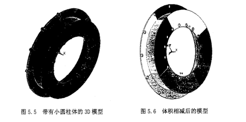 进行体相减,生成系列小孔。主要用到Subtract命令,先选择两个大面,然后选上所有的小圆柱体。最后有Replot命令生成新图形。结果如图5.6所示。
