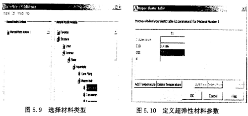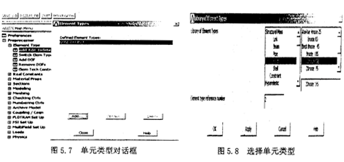考虑到分析橡胶材料所能用到的单元,选择Main Menu>Preprocessor>Element type>Add/Edit/Delete,在出现的对话框中,单击“Add”,如图5.7所示。这时又出现一个“Library of Element Type”对话框,在左面的列表栏中选择“Structural Solid”,在其右面的列表栏中选择“2Onode186”,单击0K按钮,如图5.8。再在单元对话框中单击Close按钮关闭对话框。