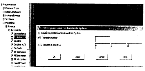 选择Main Menu>Preprocesor>Modeling>Create>Keypoints>In Active CS,在弹出的对话框中输入1关键点的坐标,如图5.11所示。单击“Apply”输入下一个点的坐标直至所有关键点完全输入。6个关键点的坐标如表5.1所示。