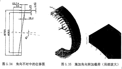 重复5.4.2节中的(1),(2),(3),(4),(5),(6)步骤。然后开始施加由于径向的位移产生的附加剪应力。角向不对中时,由于两轴之间存在一定的夹角,使得橡胶圆环最上方受到附加的拉应力,而圆环的最下端则受到附加的压应力,这个附加的拉应力σang的大小和方问随着圆环的旋转角度改变而改变,在最上方时受拉,且绝对值最大,在最下方受压,绝对值亦最大。而在平衡位置时则变成O。施加角向附加载荷后的图形如5.35所示。