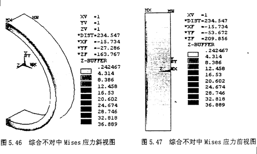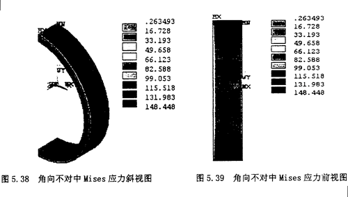 2.显示节点的Von Mises应力云图:选择Main Menu>General Postproc>Plot Result>NodalSolu,在弹出的对话框内选择“Stress”,第二栏内选择“Von Mises Stress”,则其显示的云图如图5,38,5.39所示
