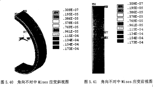 3.显示节点的Von Mises应变云图:选择Main Menu>General Postproc>Plot Result>NodalSolu,在弹出的对话框内选择“Strain”,第二栏内选择“Von Mises Strain”,则其显示的云图如图5.40,5.41所示