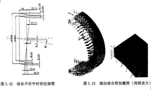 重复5.4.2节中的(1),(2),(3),(4),(5),(6)步骤。然后开始施加综合的附加载荷。由于综合位移使得橡胶圆环附加的径向拉应力σax,附加的剪应力τrad,附加的角向应力τrad,以及由橡胶圆环旋转扭矩产生的剪应力τrot。所以综合不对中的应力情况应该是σax、τrad、τrad与τrot的叠加。施加综合附加载荷后的图形图5.43所示。