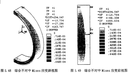 3.显示节点的Von Mises应变云图:选择Main Menu>General Postproc>Plot Result>NodalSolu,在弹出的对话框内选择“Strain”,第二栏内选择“Von Mises Strain”,则其显示的云图如图5.48,5.49所示