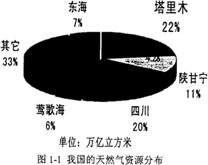 我国天然气总资源量为3.8×1013m3。其中在面积为560,000km2的塔里木盆地,天然气资源量就达8.39×l012m3。其中累计已探明地质储量4.19×l011m3,剩余可采储量2.79×l011m3,是国内天然气资源量及剩余可采储量最丰富的气区。预计今后五至十年,累计探明地质储量可达1×1012m3。此外,从图1-1可以看到,陕西、四川、青海等地的天然气储量也都十分可观,气田分布的西倾状况比较明显。