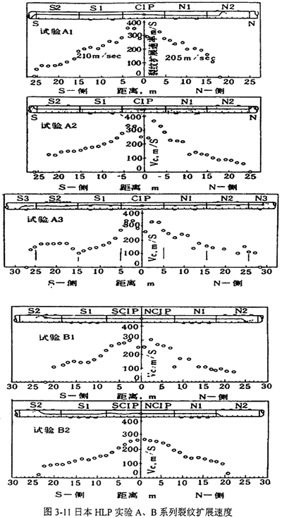 所有实验的止裂都不是在同一管段内部发生的,任意管段内均发生了减速。尤其是HLP组织的B类实验:在Bl的两侧,B2的北侧,裂纹从CIP起裂后经过的两段管子韧性相差无几,却均在第一段中持续扩展而在第二段中止裂。