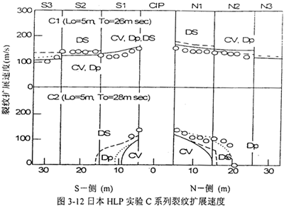 图3-11、图3-12表示日本HLP实验中裂纹扩展速率随扩展距离的变化,空心点为实测值。通过对易发生断口分离(断口分离现象将在下一章中介绍)的控轧(CR)钢和调质(QT)钢两种材料的临界止裂韧性的测试,没有发现大的差异,说明断口分离现象对动态延性断裂的止裂能力影响不大。