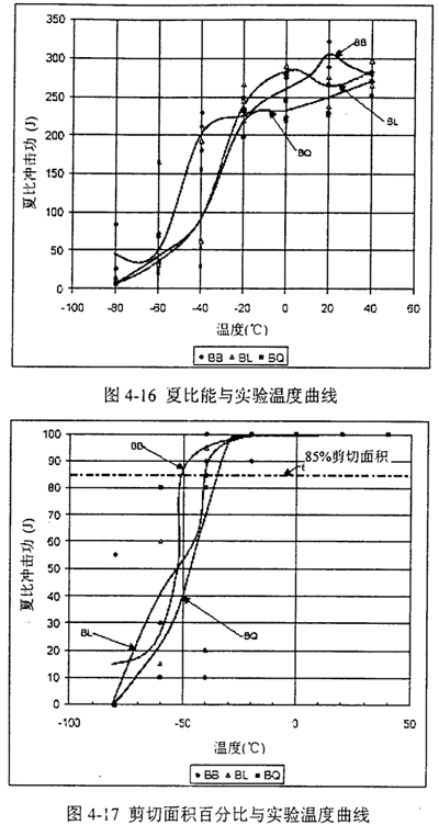 表4-3给出了归纳的夏比冲击能量值及85%剪切面积对应的转变温度。