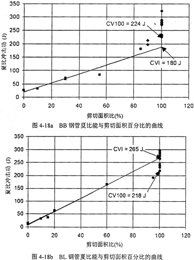 图4-18a,b,c给出了三家钢管的夏比能与剪切面积的关系,以及85%剪切面积对应的转变温度。图中CV100表示100%剪切面积时最低的夏比能,CVI表示最低夏比平台能,也称夏比转变能,CVP表示夏比平台能。菱形实验点表示剪切面积高于90%,方形实验点表示低于90%可以看到,剪切面积低于90%时,夏比能与剪切面积呈线性关系。