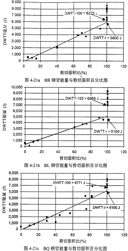 图4-21a,b,c是能量与剪切面积百分比图。和前面-样,菱形实验点表示剪切面积高于90%,方形表示低于90%。与对CVN数据的处理类似,分别定义DWTT-100表示100%剪切面积时最低的DWTT能,DWTT-I表示DWTT转变能,DWTT-P表示DWTT平台能。由图4-21可确定DWTT和DWTT-100的值。