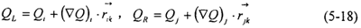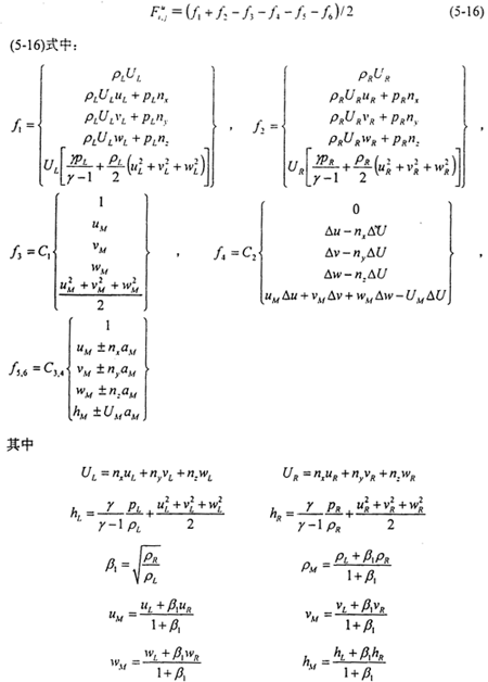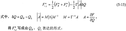 其中,(▽i和(▽j,分别为Q在单元i和j内的梯度;k为界面(i,j)的中心,表示单元j中心到k的距离矢量,表示单元i中心到k的距离矢量。将(5-18)代入(5-16),即可得到无粘通量。可以证明,这样确定的具有二阶精度。