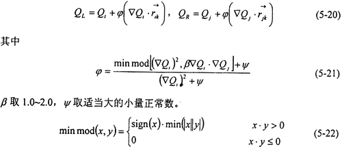 但是,由(5-18)直接得到的格式在激波附近是不稳定的,将会出现非物理振荡。迎风格式通过限制物理量的梯度值,来保证物理量在单元内的分布具有单调性,从而达到抑制间断附近非物理振荡的目的。这时,(5-18)式变为