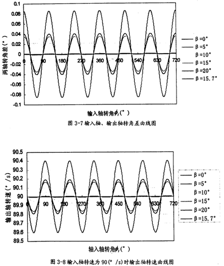 由曲线图3-7可以看出两轴的转角差相当小,即使在两轴夹角达到20o时,输入同输出的最大转角差也不到0.1o,所以在一定的程度上认为输入、输出转角相同是有一定的道理的。且转角差随两轴夹角β的增大而增大,变化的频率为一个回转周期3次。