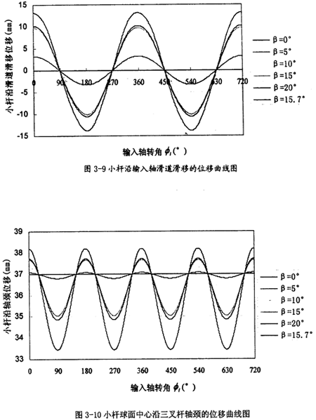 由曲线图3-9可以看出,小杆沿滑道的位移随两轴夹角β的增大而增大,变化量也比较大,变化频率为一个回转周期1次。这可以作为三叉杆万向联轴器设计中,小杆长度的设计依据。
