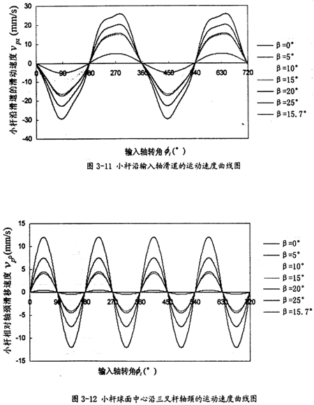 由曲线图3-12可以看出,小杆球面中心P沿轴颈的线速度随两轴夹角β的增大其最大值增长也较快,它的变化频率为一个回转周期2次,曲线上下对称这一数值可以作为动力分析中摩擦计算的重要依据。