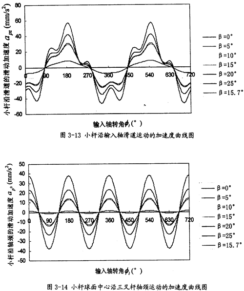 由曲线图3-13可以看出,小杆沿滑道的运动加速度其变化较为复杂,变化具有周期性,变化频率为一个回转周期1次。随两轴夹角β的增大其最大值增长较快,它的值可以作为动力分析和设计计算的重要依据。