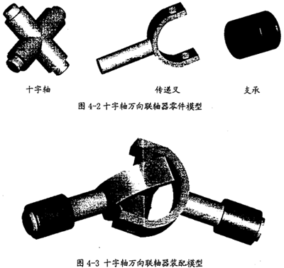 当前,在工程领域,应用美国PTC公司的CAD软件Pro/E和美国MDI公司的动力学仿真软件ADAMS联合进行复杂机械系统的动力学仿真研究是一种较实用、较流行的仿真方案。本文的仿真分析中所有模型均是采用这种方案。考虑到建模的注意因素,在用Pro/E建模的过程中,省去了十字轴万向联轴器的许多细小结构,如润滑部分、滚针轴承、弹簧卡圈等,只是保留了十字轴万向联轴器在原理上进行传动的必需构件和运动副。在此原则下建立的十字轴万向联轴器的各构件模型如图4-2所示,实际上只包含十字轴和传递叉两个活动构件。建立的十字轴万向联轴器的装配模型如图4-3所示。