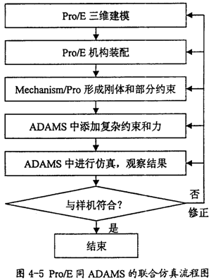 在仿真中如果发现结果不对,则我们需要对前面的模型进行修正,然后再做仿真分析,直到结果正确。总而言之利用Pro/E和ADAMS进行联合仿真,其基本的步骤如图4-5所示。