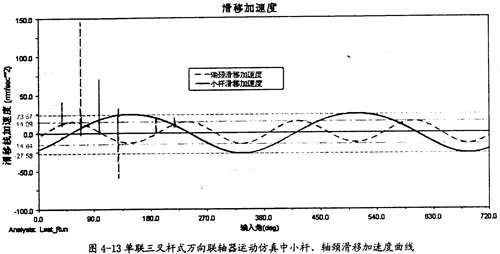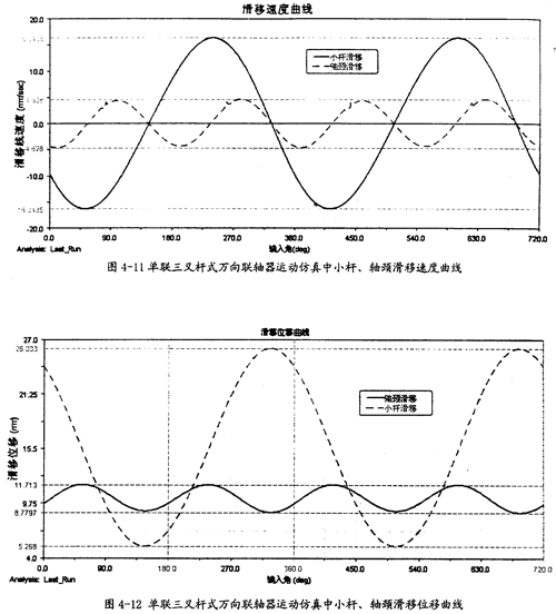 由图4-11可以知道,在一定的夹角下,小杆在滑道中的滑移速度同小杆球面中心相对轴颈的滑移速度是不同的,前者要远大于后者,且它们变动的频率也不一样,在一个回转周期中,前者频率是1次,而后者是2次。此图中的两曲线同第三章中的理论分析曲线图3-11、图3-12是吻合的,只是小杆滑移的速度曲线在外形上有一点差异,仿真的曲线相当的平滑、规则,但理论分析曲线却不规则,这可能是在计算中简化和省略的原因。尽管如此,这也证明了三叉杆式万向联轴器理论分析中对小杆滑移速度和轴颈滑移速度这两项计算的正确性。