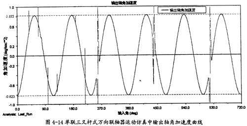 由图4-9可以知道,当输入轴转速恒定为90o/s时,输出轴并不作恒速转动,而是以90o/s为中心,作非常有规律的周期性运动,在每一个回转周期中,它的变化频率为3次。这里的结果同第三章中的曲线图3-8也是完全吻合的,因此在一定的程度上也证明了三叉杆万向联轴器转速分析理论的正确性。
