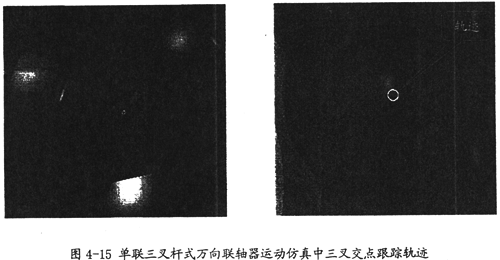 由图4-15可以看出,在单联三叉杆式万向联轴器的运动仿真中,三叉交点运动轨迹是一个圆,相对于半径值R(此值的意义见第三章)它的半径是相当小的,这也解释了为何运动中两轴夹角在不断作微小的变化,同时也证明了轴头中心轨迹理论的正确性。