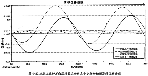 由图4-22可以看出,双联三叉杆式万向联轴器在运转的过程中,左右两端的小杆滑移位移量几乎相等,左右两端轴颈的滑移位移量也接近等值,且轴颈的滑移位移量比小杆沿滑道滑动的位移量要小得多,这同单联三叉杆式万向联轴器的特性是相同的。