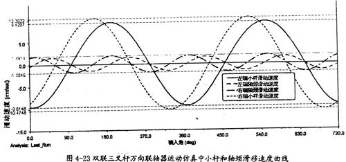 由图4-23可以看出,双联三叉杆式万向联轴器在运转的过程中,左右两端的小杆滑移速度几乎相等,左右两端轴颈的滑移速度也接近等值,且轴颈的滑移速度比小杆沿滑道滑移速度要小得多,它们的变化频率同单联时的情况相比也无变化,在大小上同β=10°的单联三叉杆式万向联轴器的特性是相同的。