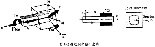 移动副产生摩擦的示意图如图5-2所示。在这种运动副中只会产生逆向于移动方向v(如图5-2中蓝色箭头所示)的摩擦力Ffrict(如图5-2中红色箭头所示),它的产生主要由三种因素,即构件间相互作用的径向力F、构件间相互作用的扭矩Tn、构件间相互作用的弯矩Tm(这三种力如图5-2中绿色箭头所示)。在施加由这些作用力产生的摩擦力时,要考虑径向力F的大小、等效作用臂长Rn(如图5-2中右边图所示运动副间的重叠量和重叠量的变化情况、扭矩Tn的大小和它的等效反作用臂长Rn、弯矩Tm的大小和弯矩的反作用臂长XS(如图5-2中间图所示)。另外还得考虑静摩擦系数、动摩擦系数及预载荷的作用。