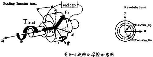 旋转副产生摩擦的示意图如图5-4所示。在这种运动副中只会产生逆向于旋转方向ω(如图5-4中蓝色箭头所示)的摩擦扭矩Tfrict(如图5-4中红色箭头所示),它的产生主要由三种因素,即构件间相互作用的径向力Fr、构件间相互作用的轴向力Fa、构件间相互作用的弯矩Tr(这三种力如图5-4中绿色箭头所示)。在施加由这些作用力产生的摩擦力时,要考虑径向力Fr的大小、圆柱半径RP(如图5-4右图所示)、轴向力Fα的大小、摩擦半径Rn的大小(如图5-4右图所示)、弯矩Tm的大小和弯矩的反作用臂长(即旋转副的长度,如图5-4中左图所示),另外还得考虑静摩擦系、动摩擦系数及预载荷的作用。