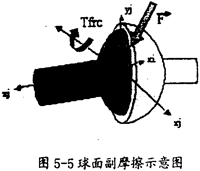 球面副产生摩擦的示意图如图5-5所示。在这种运动副中只会产生逆向于旋转方向的摩擦扭矩Tfrc(如图5-5中红色箭头所示),它的产生只有一种因素,即构件间相互作用的径向力F(如图5-5中灰色箭头所示)。在施加由相互作用的径向力F产生的摩擦力时,要考虑径向力F的大小和球半径,另外还得考虑静摩擦系数、动摩擦索数及预载荷的作用。