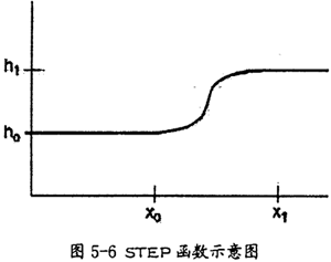 在ADAMS中,STEP函数近似一个标准的数学STEP函数(没有不连续性),并逐步逼近数值,例如:驱动或者力,向上或者向下或者打开和关闭。它的函数图形如图5-6所示。格式同各参数说明如下: