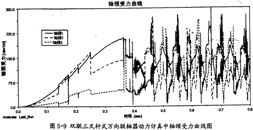 由图5-9可以看出,双联三叉杆式万向联轴器在动力仿真的过程中, 双联三叉杆一端的三轴颈同内球头的圆柱副上的作用力变化趋势同图5-8中的小杆变化趋势是相同的。由于它们的受力变动复杂,故这三力在双联三叉杆一端上的向量和也可能不为0。这样在双联三叉杆上也会产生附加弯矩的作用。而且轴颈受力平均较小杆的受力要大。