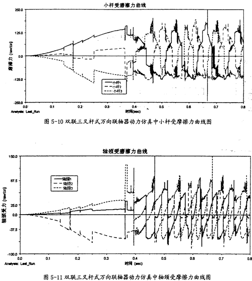 由图5-10可以看出,双联三叉杆式万向联轴器在动力仿真的过程中,其一端的三小杆同滑杆套轴间的摩擦力变化相当有规律。当小杆相对滑杆套轴运动反向时,它们就会在正负间有规律的切换。