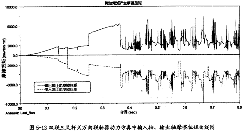 由图5-12可以看出,双联三叉杆式万向联轴器在动力仿真的过程中,其一端的三个小杆所受的摩擦力的合力变动较有规律,其值在开始一段平滑,其后几乎以0为中心波动。由于这三个摩擦力的方向均平行于输入轴或输出轴轴线,故此合力会在输入轴和轴出轴上产生轴向的力,在输入轴和输出轴上产生摩擦扭矩。如取其水平较高值60牛来计算,它产生的摩擦扭矩为270N·mm(60×0.3×15=270,其中0.3为动摩擦系数,15为摩擦半径),此值相对图5-13中的值而言相当小。