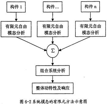通过对系统中的各构件进行有限元自由模态分析,得到各构件的自由模态(当然也包含了6个刚体模态),以各构件的连接关系为依据,建立边界条件,然后进行模态综合,即可计算得到整个系统的动特性和响应。其过程如图6-2。