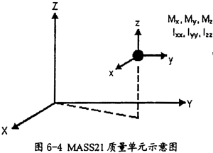 此单元为一个有六自由度的质量单元。此单元的第一个不同的坐标方向上可以施加不同的质量大小和转动惯量。质量单元是由单个节点、单元坐标方向的集中质量系数、单元坐标轴的旋转惯性所决定的。为了在加入质量单元后不影响系统的惯性属性,在此单元的实常数设定中惯性量应设定的非常小(如小于10-4)。单元如图6-4所示。