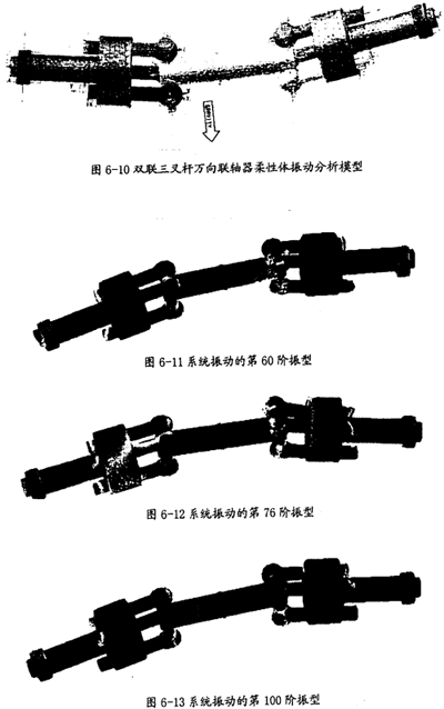 从表6-1、表6-2、表6-3同表6-4的频率值的比较以及分析过程中所看到的各构件和双联三叉杆万向联轴器系统的振型,发现了如下现象: