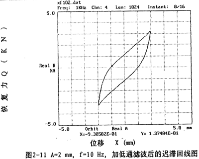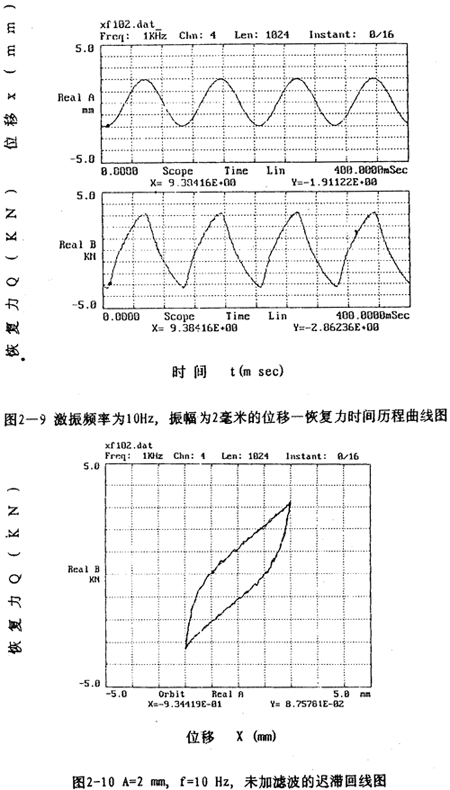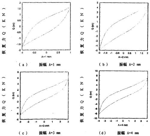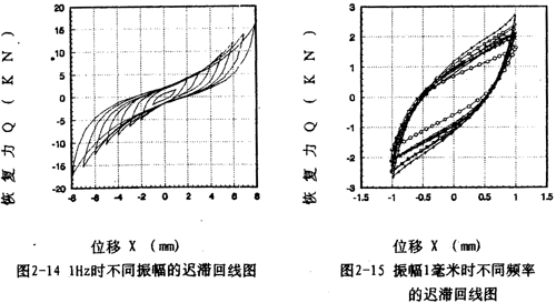 图2-9(见26页)表示激振频率为1OHz,振动位移幅值为±2毫米的位移和恢复力时间历程图,图2-10(见26页)、图2-11(见27页)为对应的迟滞回线图。图2-l2(见27、28页)表示激振频率为IHz,振动位移幅值分别为±(1-8)毫米的位移一恢复力图,图2-14(见29页)则为图2-12的合图,由图2-14同频率不同振幅的八条迟滞回线分析可知,大挠度刚丝绳弹性联轴器的动刚度与振动幅值有关,同时,从迟滞回线面积(表示联轴器阻尼所耗散的能量)可知联轴器的阻尼与振动幅值也有关,即联轴器的动刚度和阻尼均是振幅的非线性函数。