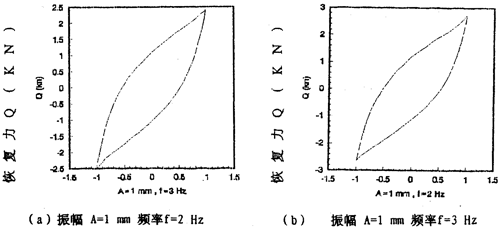 图2-13(见28、29页)表示振幅为l毫米,激振频率分别为2,3,4,6,8,10Hz的迟滞回线图,图2-15(见29页)表示振幅为1毫米,激振频率为1,2,3,4,6,8,10,20,30Hz的迟滞回线合图。由图2-15可知,弹性联轴器的动刚度与振动频率有关,即随着频率增大,对应的迟滞回线的恢复力与位移的比值变小,当频率在8Hz至30Hz范围内时,迟滞回线基本重合,由此可知钢丝绳联轴器动刚度在一定频率范围内与频率有关、当频率增大到8Hz以后,联轴器的动刚度不再随频率变化而变化,因而联轴器的动刚度在一定频率范围内与频率有关,当频率增大到8Hz以后,联轴器的动刚度不再随频率变化而变化,因而联轴器的动刚度在一定频率范围内是频率的非线性函数,当频率增大到一定值后,动刚度与频率无关,同样,联轴器的阻尼在一定频率范围内的频率的非线性函数,当频率增大到一定值后(这里是8Hz),阻尼与频率无关。