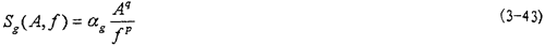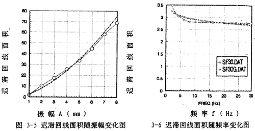 对于(3-22)模型,我们用阻尼耗能的能量关系来辨识阻尼力与振幅和频率的关系。在前面,迟滞回线面积(即阻尼耗能)与振幅的函数关系已建立起来,见(3-38)式,而且式中参数也已辨识出。同样,用数值积分,可以算出振幅一定,频率变化时迟滞回线的面积,由此得出迟滞回线面积与频率的对应关系,将这些对应关系画成曲线如图3-6中大圆点曲线所示。由迟滞回线面积随频率变化的规律分析,可建立其函数关系为: