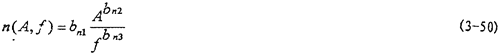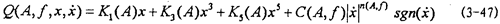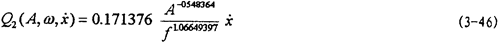 的函数,或者说恢复力Q是刚度函数K1(A),K3(A),K5(A)和阻尼函数C(A,f)以及阻尼成分函数n(A,f)的函数,其中阻尼成分函数n(A,f)描述阻尼的组成情况,n(A,f)=0时,阻尼为干摩擦阻尼,n(A,f)=1时,为粘性阻尼,0<n(A,f)<1时,阻尼由粘性阻尼和干摩擦阻尼组成,n(A,f)>1时,阻尼成为“高阶”阻尼。对于(3-47)式,当振幅与频率一定时,式中的Kl(A),K3(A),K5(A)和n(A,f)均为定数,当振幅A和频率变化时,它们均是函数,因此参数辨识实质上是参数函数的辨识。首先我们用非线性参数辨识方法Marquardt法,根据试验所得的数据,按照(3-47)式对每一迟滞回线进行参数辨识,可以得到对应的K1(A),K3(A),K5(A),C(A,f)和n(A,f)值,对每种工况下的数据随振幅和频率变化趋势进行分析后,可以建立刚度函数、阻尼函数和阻尼成份函数的数学表达式为: