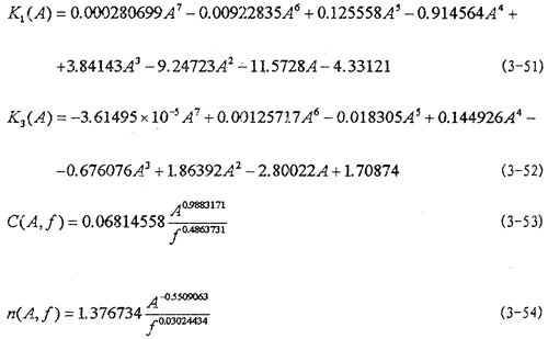 然后用线性参数辨识法和非线性参数辨识法,根据上面已经得到的各个工况下K1(A),K3(A),K5(A),C(A,f)和n(A,f)的数值对(3-48)、(3-49)、(3-50)式中各参数进行辨识,将辨识得到各参数代入(3-48)、(3-49)和(3-50)式得: