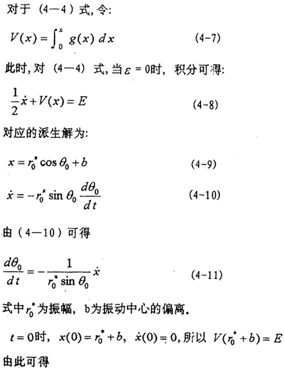 目前文献上的一些方法对于弱非线性系统是有效的,而对于(4-2)式的强非线性系统则遇到了麻烦。由于描述非线性振动系统的微分方程种类繁多,没有普遍的解法,因此,仍然只有极少非线性振动方程可求得精确解。可行的办法是针对不同非线性振动方程的特点寻求一些近似数值解法。为研究方便,将(4-2)式进一步写成以下形式: